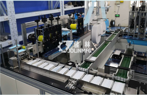 本生産ラインは全自動1ライン2プロダクツで、本體1臺で2臺のゴム付機がついています。本設(shè)備でマスク本體部が出てきた後、コンベア機構(gòu)によって繋ぎ部へ送られ、再度本體加工部へ送られます。耳帯機で耳かけ紐を溶接し、マスク製品の完成です。